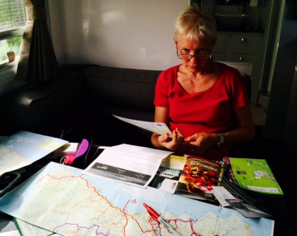 Jayne seriously planning the next day of Adventure (Or maybe just waiting on me to pour her a glass of Chardy)