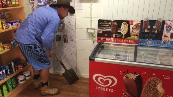 The Husband appeared promptly and us men then set about doing our best to defend the damsels in distress. Husband invoked Plan A & poked at the ice cream machine a couple of times but no snake appeared. We hatched a Plan B. I’d move the ice cream machine and he’d be ready with the spade.