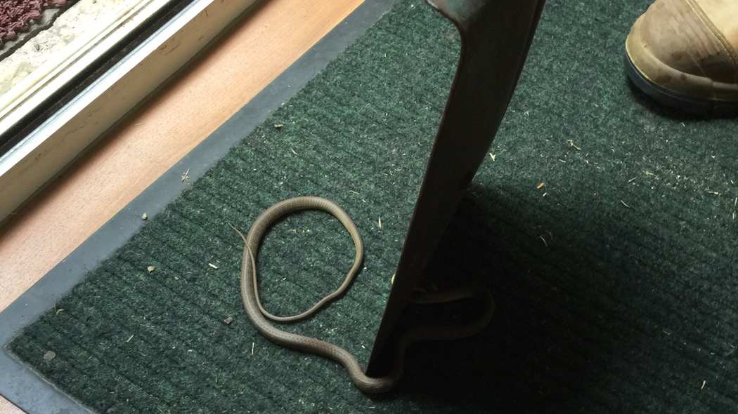 Jayne had opened the sliding screen to let herself in and a snake slivered in at the same time. I have no idea how she didn’t step on it.