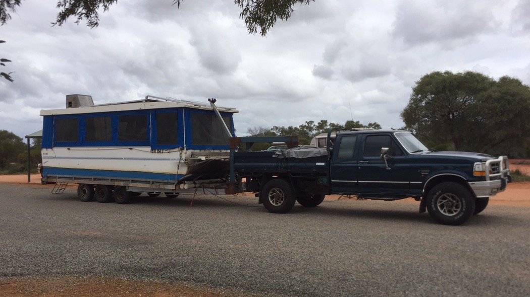 We see some interesting rigs in our travels. This one is a houseboat on a trailer that doubles as a caravan.